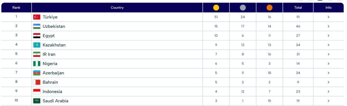 Ayni damda O'zbekiston hisobida 15 ta oltin, 15 ta kumush va 12 ta bronza medallari mavjud. Delegaciyamiz medallar jamg'arish reytingida hamon ikkinchilikni o'zida saqlab kelmoqda. Turkiya esa 51 ta oltin, 24 ta kumush va 16 ta bronza bilan o'z peshqadamligini davom ettirmoqda.