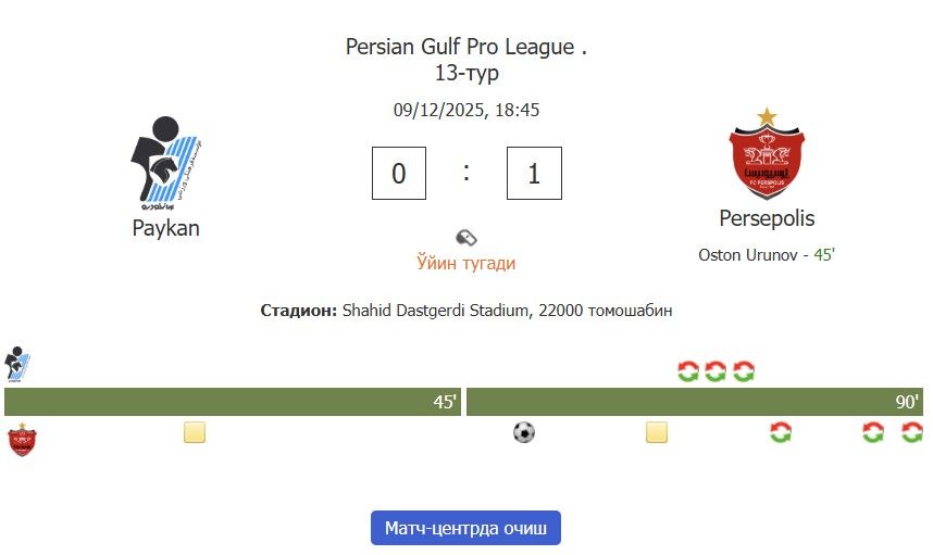 Unda Oston O'runov harakat qilayotgan "Persepolis" kichik hisobda g'alabaga erishdi. Qayd qilish kerak, bahsdagi yagona golni hamyurtimiz kiritdi.