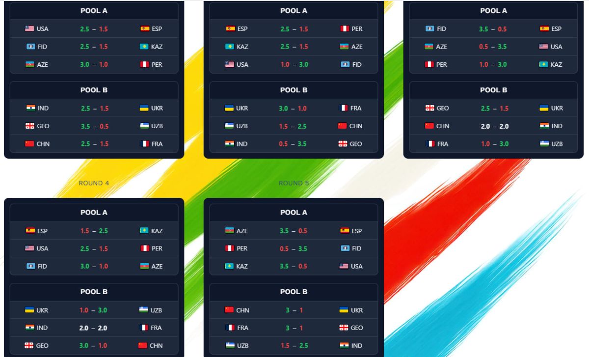 “World Women’s Team Championship 2025” musobaqasida 12 davlat terma jamoalari ishtirok etmoqda. O'zbekiston ayollar terma jamoasi “V” guruhida Gruziya, Xitoy, Hindiston, Franciya va Ukraina jamoalariga qarshi bahs olib bordi.