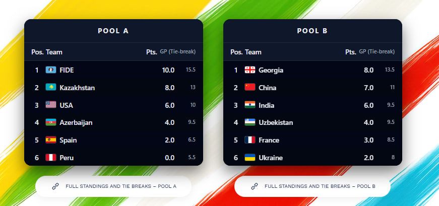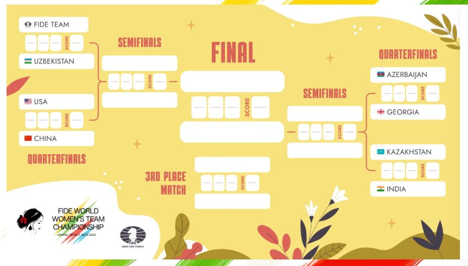 Bugun bizning vaqt bilan soat 17:30 da boshlanadigan chorak finalda O'zbekiston ayollar terma jamoasi FIDE jamoasiga qarshi bahs olib boradi.