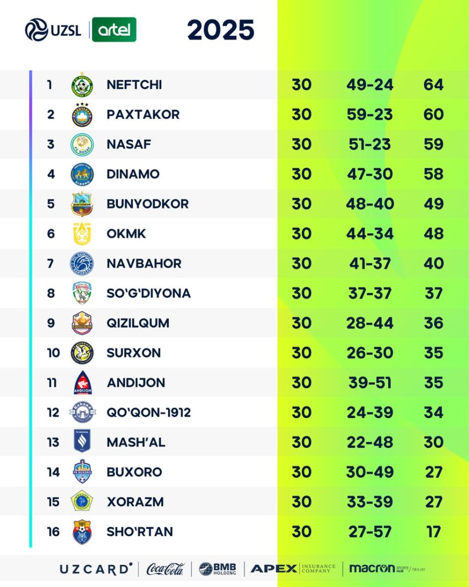 Futbol bo'yicha 2025 yilgi O'zbekiston Superligasi o'z yakuniga etdi.