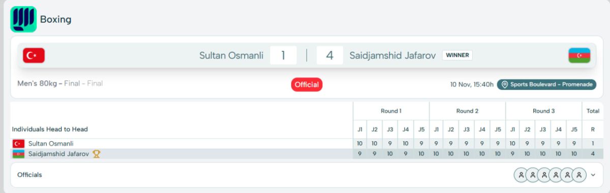 23:49. Buxorolik bokschi Saidjamshid Jafarov Ozarbayjon terma jamoasiga oltin medal taqdim etdi. U finalda turkiyalik Sultan Osmanlini 4:1 hisobida mag'lubiyatga uchratdi.