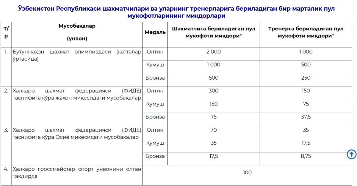 SHuningdek, O'zbekiston Respublikasi Prezidentining 2022 yil, 5 avgustdagi PQ-347-sonli qaroriga muvofiq, bazaviy hisoblash miqdorining 300 baravari miqdorida pul mukofoti beriladi. Bugungi kunda BHM 412 ming so'mni tashkil etadi. Demak, O'zbekiston hukumati tomonidan beriladigan pul miqdori 123 million 600 ming so'mni tashkil etadi.