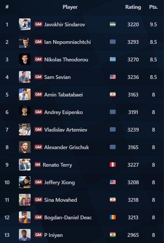 Quvonarlisi, shveycarcha tizimda 11 turdan iborat kechagi kun turnirida Javohir Sindarov 9,5 ochko bilan chempionlikni qo'lga kiritdi. Jahon kubogi g'olibi bo'lgan shaxmatchimiz musobaqa davomida Yan Nepomnyanshiy, Vladislav Artemev, Maksim Vashe-Lagrav singari taniqli raqiblarini taslim etdi.