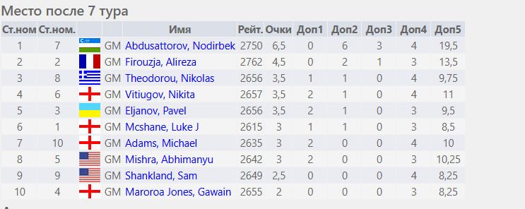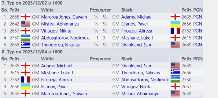 Abdusattorov eng yaqin taqibchisi turnirda birinchi raqam ostida tasniflangan franciyalik Alireza Firuzdjani endi 2 ochkoga ortda qoldirmoqda va qizig'i, ertaga 8-turda ular o'zaro to'qnash kelishadi. Kamida durang natija Nodirbek Abdusattorovni muddatidan avval London Chess Classic 2025 chempioniga aylantiradi.