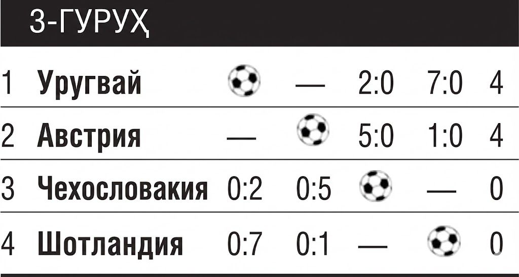 Tezkor qanot hujumchilari Borxes va Abbadi to'xtatib bo'lmas darajada harakat qilishdi: ular o'zlari ham gol urishdi va avvalgi urugvayliklarning eng yaxshi snayperi bo'lgan Migesni ham to'plar bilan "siylashdi". Barchasi 7:0 hisobidagi yirik mag'lubiyat bilan tugadi. Borxes darvozani uch marta ishg'ol qildi, Miges va Abbadi esa – ikki martadan. O'z navbatida avstriyaliklar chexlarni shafqatsizlarcha mag'lub etishdi. 24-daqiqaga kelib hisob allaqachon 4:0 ko'rinishini olgandi, buning ustiga shotlandlarga g'alaba golini urgan Erix Probst 20 daqiqa ichida xet-trik qayd etdi. Ikkinchi bo'limda Stoyaspal uchrashuvga nuqta qo'ydi.