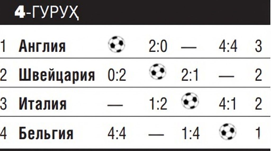 Ikkinchi turda italiyaliklar belgiyaliklardan "qasos" oldi – 4:1 hisobida yirik g'alaba qozondi, mezbonlar esa ancha zerikarli o'yinda angliyaliklarga 0:2 hisobida yutqazdi. Natijada qo'shimcha o'yin – Italiya va SHveycariya uchrashuvini o'tkazishga to'g'ri keldi.