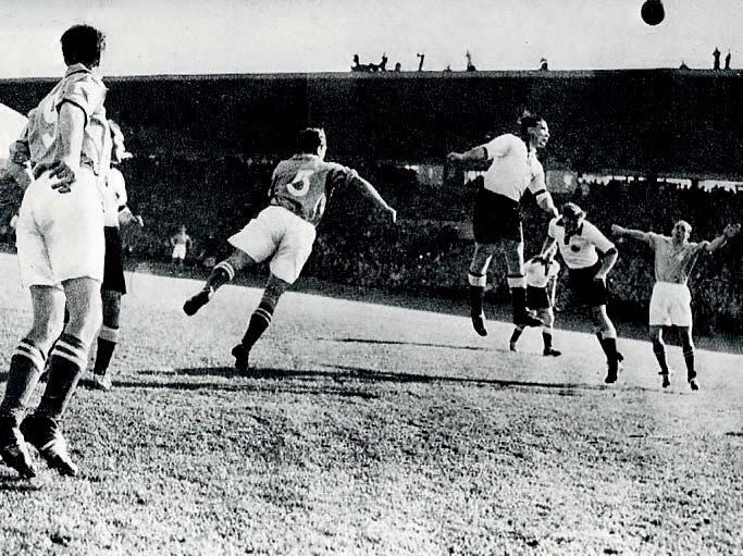 Inglizlarga ob-havo borasida omad kulib boqmadi – Urugvay bilan ular janubiy amerikaliklar uchun odatiyroq bo'lgan 30 darajali issiqda o'ynashga majbur bo'lishdi. "Moviyranglilar" klassik sxemalarga o'rganib qolgan inglizlarni qayta-qayta qiyin ahvolga solib qo'yishdi va poziciyalarni almashtirgan holda chiroyli kombinaciyalar uyushtirdi. Garchi futbol mamlakati vakillari jahon chempionlarining qanot hujumchilari faolligini jilovlashga muvaffaq bo'lishgan va Billi Rayt dahshatli Migesni o'yindan butunlay chiqarib tashlagan bo'lsa-da, urugvayliklar improvizaciya va ijodkorlikda evropaliklardan yaqqol ustun kelishdi. Hisobni beshinchi daqiqadayoq Borxes ochdi, biroq ko'p o'tmay Loftxaus yiqilib zarba bergan holda hisoni tenglashtirdi. Varelaning golidan so'ng urugvayliklar yana oldinga chiqib olishdi, ikkinchi bo'lim boshida esa hisobni 3:1 ga etkazishdi. Inglizlar Tom Finnining goli bilan javob qaytarishdi, ammo Xaver Ambroys ikki to'p farqini tikladi. G'alaba urugvayliklarga qimmatga tushdi, chunki birdaniga uchta etakchi o'yinchi – Varela, Abbadi va Miges jiddiy jarohat oldi.