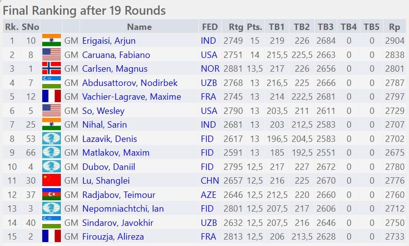 Bu 13 ochko jamg'arganlar orasida eng yaxshi natija bo'ldi. Lagrav esa 5-o'rin bilan jahon chempionatidagi ishtirokini yakunladi. Reglamentga muvofiq kuchli to'rtlikdan joy olganlar endi blic bo'yicha jahon chempionlik unvoni uchun o'zaro bahs olib borishadi.
