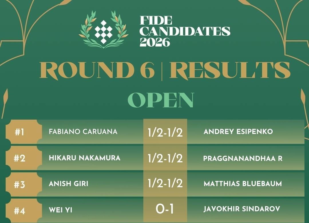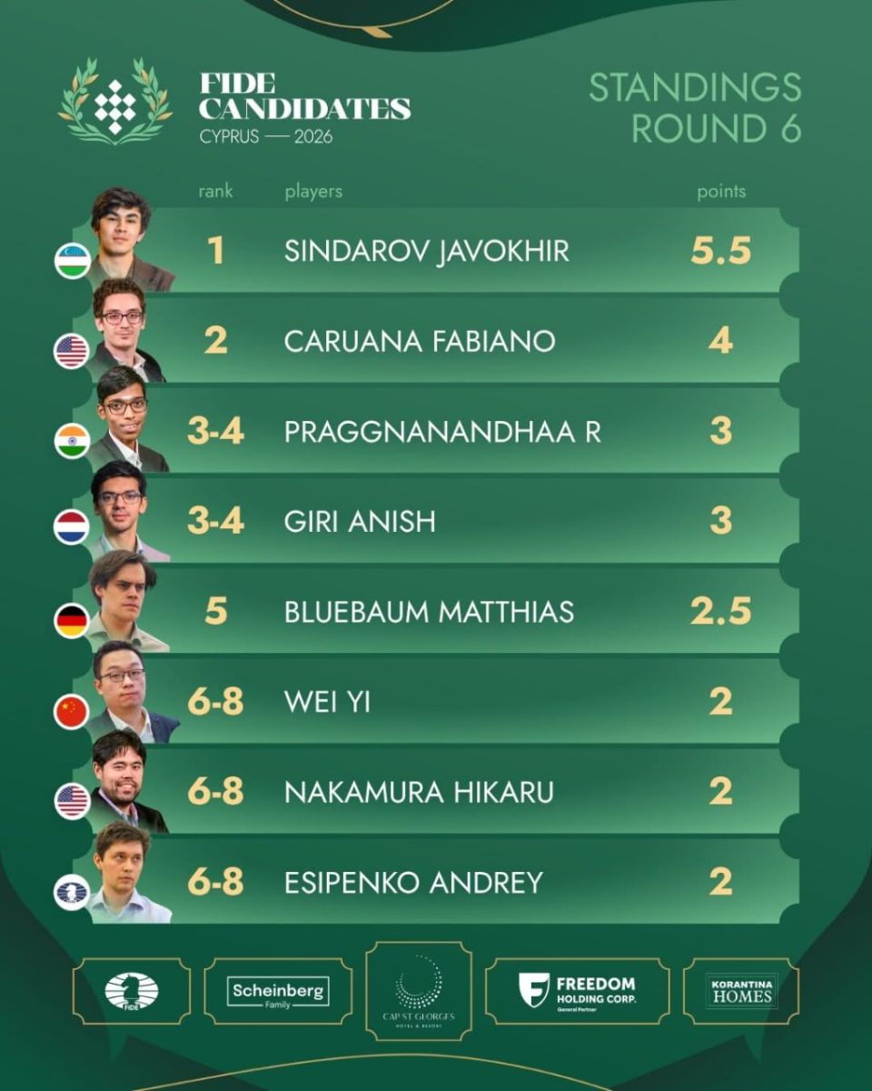 Xabar berganimizdek, kecha nufuzli musobaqaning 6-turida grossmeysterimiz Javohir Sindarov qora donalarda o'ynaganiga qaramay, xitoylik Vey Yini mag'lubiyatga uchratgandi. Ushbu g'alaba sabab Javohir 1,5 ochko farq bilan peshqadamga aylanib oldi. Bunga uning eng yaqin taqibchisi amerikalik Fabiano Karuananing rossiyalik Andrey Esipenko bilan durang o'ynagani sabab bo'ldi.
