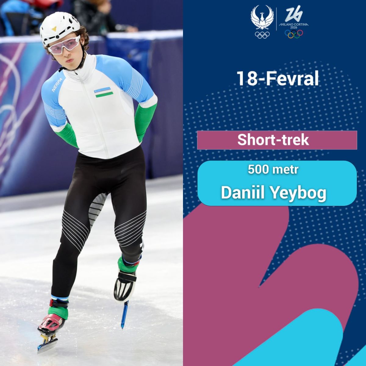 Bugun short-trekchimiz Daniil Eybog Italiyada o'tkazilayotgan qishki Olimpiya o'yinlarida yana startga chiqadi.
