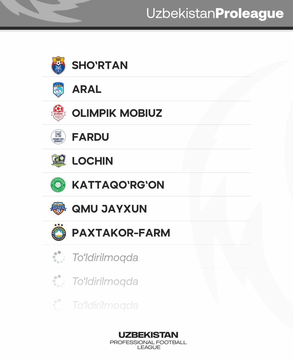 Bundan tashqari, kamida "Metallurg" va "G'azalkent" klublari ham yuqoridagi klublar safidan joy olishi kutilmoqda. "Olimpik" jamoasi esa Proliga ishtirokchilari safidan chiqadi shekilli, PFL bergan ro'yxatda bu jamoani ko'rmayapmiz.