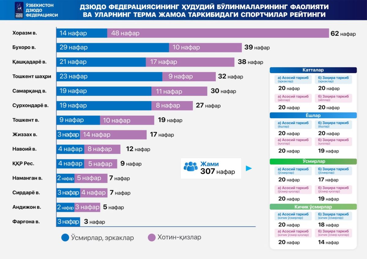 Hududlar kesimida eng yuqori ko'rsatkich Xorazm viloyatiga tegishli bo'lib, 62 nafar dzyudochi terma jamoa tarkibiga kiritilgan. Buxoro (39), Qashqadaryo (38) va Toshkent shahri (32) yuqori natijalarni qayd etgan hududlar qatorida etirof etildi. Samarqand, Surxondaryo, Jizzax, Navoiy, Toshkent viloyatida ham bu borada ishlar ijobiy ko'rinishda. Bu yil Sirdaryo viloyatida ham o'sish ko'zga tashlandi.