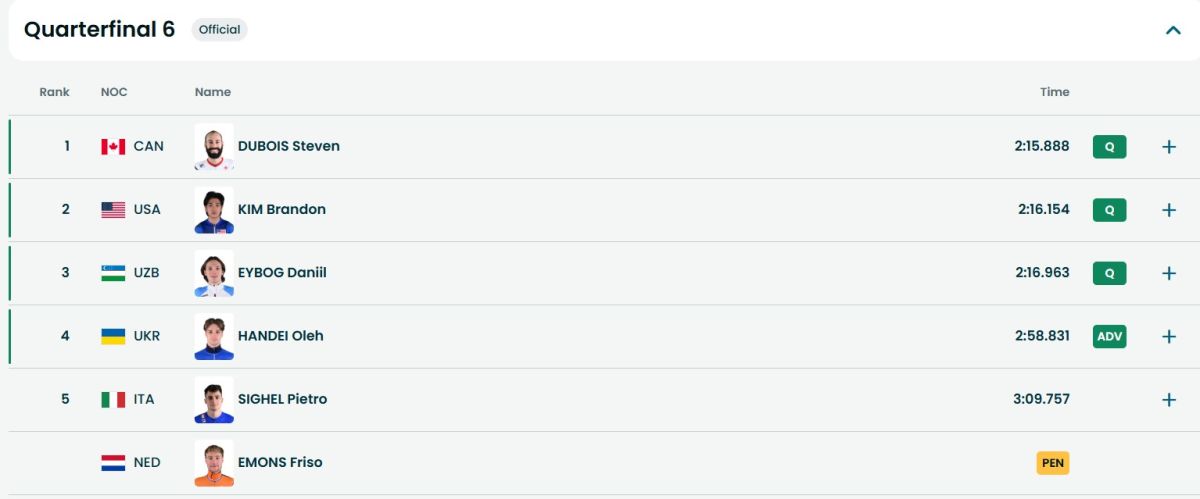 Milan-Kortina Olimpiadasining short-trek bo'yicha erkaklar o'rtasidagi 1500 metr masofaga poyganing chorak final bahslari bo'lib o'tdi.