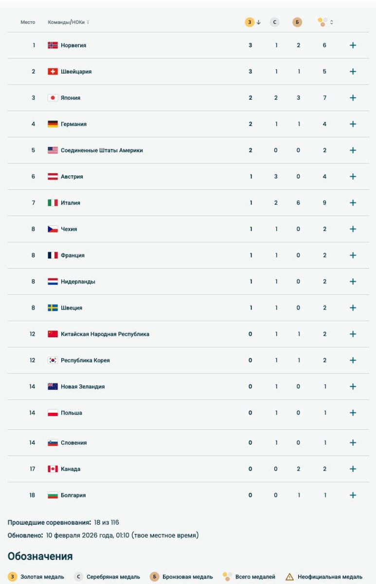 Qishki Olimpiada. Uchinchi kundan keyingi medallar jamg'arish reytingi: