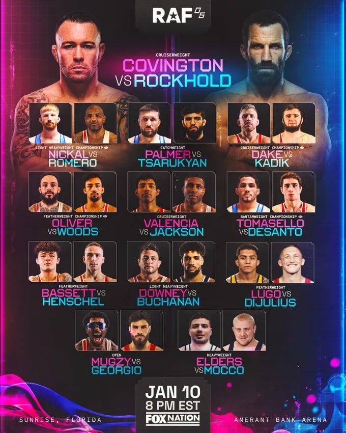 Oqshomning asosiy bellashuvi o'rta vazn toifasida sobiq UFC chempioni Lyuk Rokxold hamda Kolbi Kovington o'rtasida bo'lib o'tadi. Turnirning co-main event jangida yarim og'ir vazn toifasi vakillari Bo Nikal va Yoel Romero RAF chempionligi uchun kurash olib boradi.