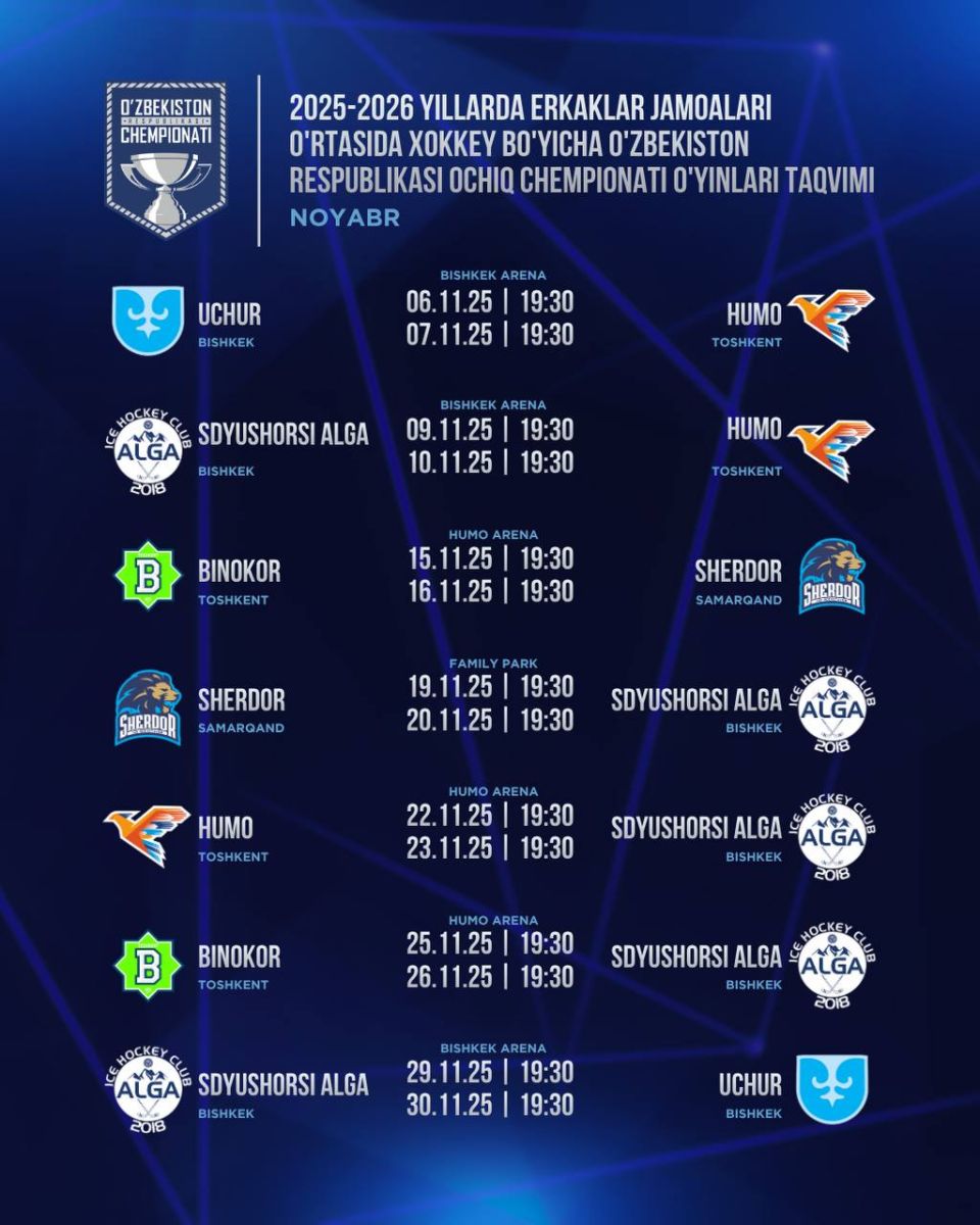 CHempionatning dastlabki rejalashtirilgan o'yinlari 6-10 noyabr kunlari Bishkekdagi "Bishkek Arena"da bo'lib o'tadi", deyiladi tashkilot xabarida.