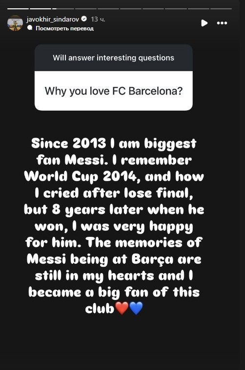 "2013 yildan beri Messining katta muxlisiman. 2014 yilgi Jahon chempionatidagi mag'lubiyatni va o'shanda qanday yig'laganimni eslayman, ammo oradan 8 yil o'tib u chempion bo'lganida, u uchun juda xursand bo'lganman. Messining "Barselona"dagi o'yinlarini eslayman va o'shandan beri men bu jamoaning katta muxlisiman", - deb yozdi Sindarov.