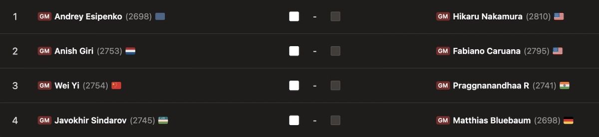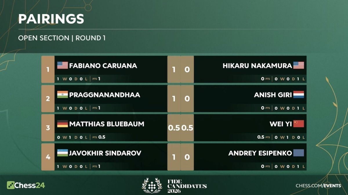 Birinchi turdan so'ng turnir jadvalida Fabaino Karuana qo'shimcha ko'rsatkichlarga ko'ra peshqadam bo'lib turibdi. Javohir Sindarov ikkinchi o'rinni band etgan bo'lsa, Rameshbabu Praggnanandha kuchli uchlikka yakun yasagan.