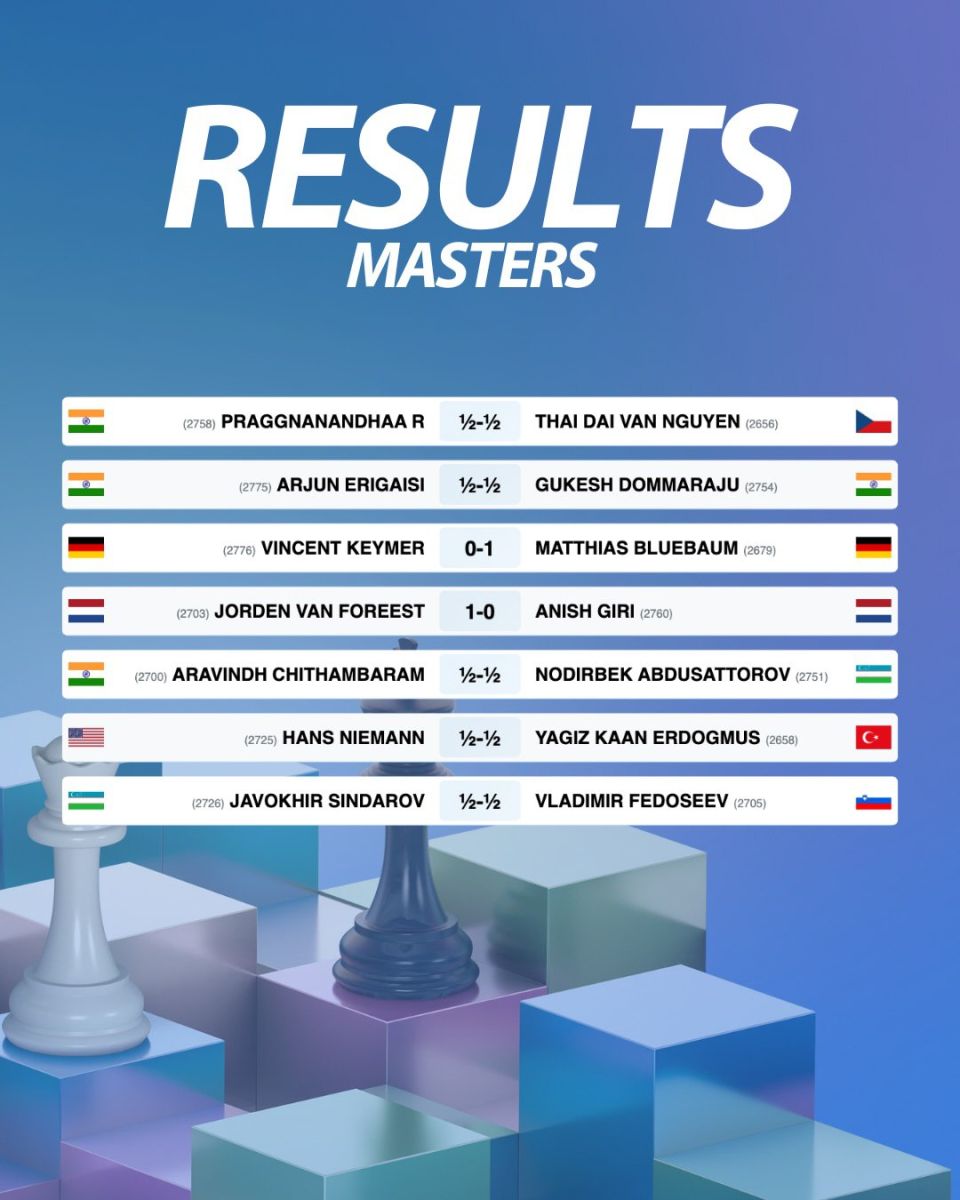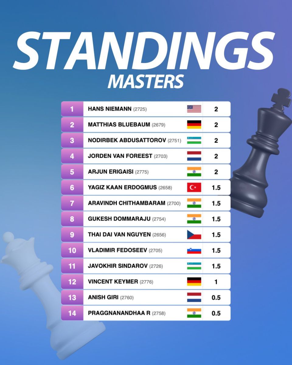 Turnirning kuchlilar jam bo'lgan "Masters" guruhida dunyoning etakchi 14 nafar grossmeysteri qatorida hamyurtlarimiz Nodirbek Abdusattorov va Javohir Sindarov ham bosh sovrin uchun bahs olib boryapti.