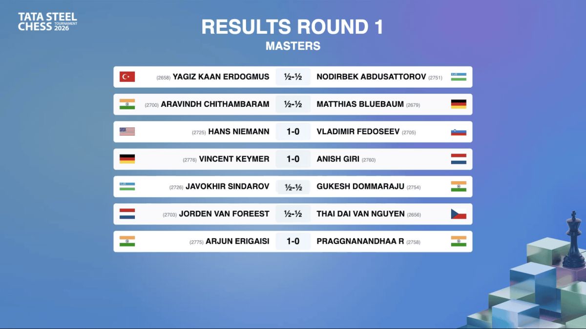 Tata Steel Chess turnirining amaldagi chempioni Rameshbabu Pragnanandha Hindiston derbisida vatandoshi Arjun Erigaisiga imkoniyatni boy berdi. Amerikalik Hans Niemann va germaniyalik Vinsent Keymer ishtiroklarini g'alaba bilan boshlashdi. Qolgan partiyalar durang natija bilan yakuniga etdi.