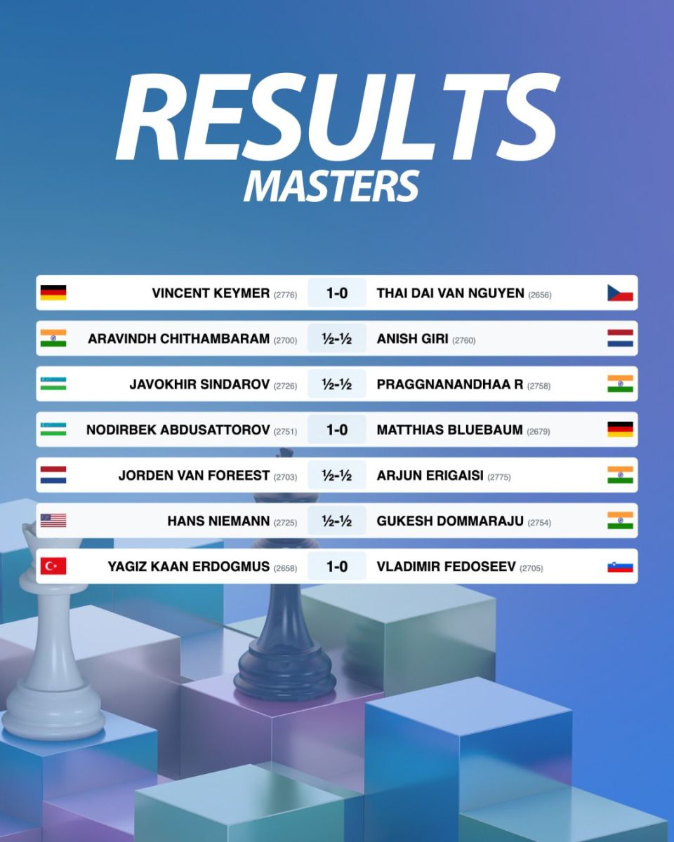 Germaniyalik Vinsent Keymer chexiyalik Tay Dai Van Nguendan ustun keldi. Sloveniyalik Vladimir Fedoseev turkiyalik 14 yoshli grossmeyster Yagiz Kaan Erdogmushga yutqazib qo'ydi. Mezbonlar vakili Anish Giri hind shaxmatchisi Aravindh CHitambaram bilan durang qayd etdi. Amaldagi jahon chempioni Gukesh Dommaradju esa qora donalarda amerikalik Hans Niemann bilan ochkolarni bo'lishib oldi.