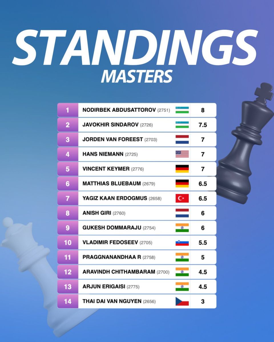 Turnirning kuchlilar jam bo'lgan "Masters" guruhida dunyoning etakchi 14 grossmeysteri qatorida hamyurtlarimiz Nodirbek Abdusattorov va Javohir Sindarov ham bosh sovrin uchun bahs olib boryapti. Kecha tunda o'tkazilgan 12-turdan so'ng Nodirbek 8 ochko bilan yana yakka karvonboshi bo'lib oldi.