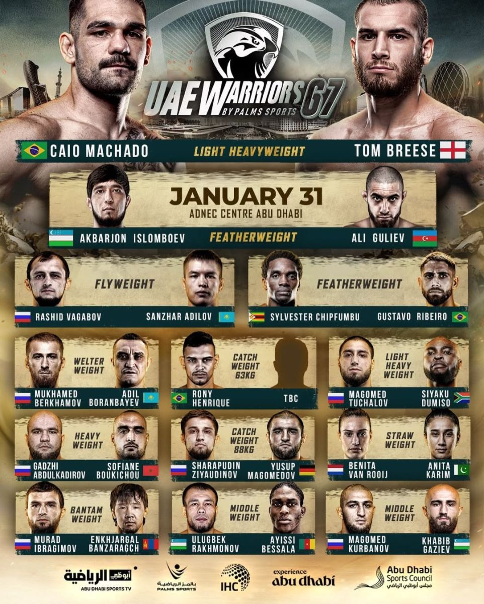 31 yanvar kuni Birlashgan Arab Amirliklari poytaxti Abu-Dabi shahrida MMA bo'yicha UAE Warriors 67 turniri tashkil etiladi.
