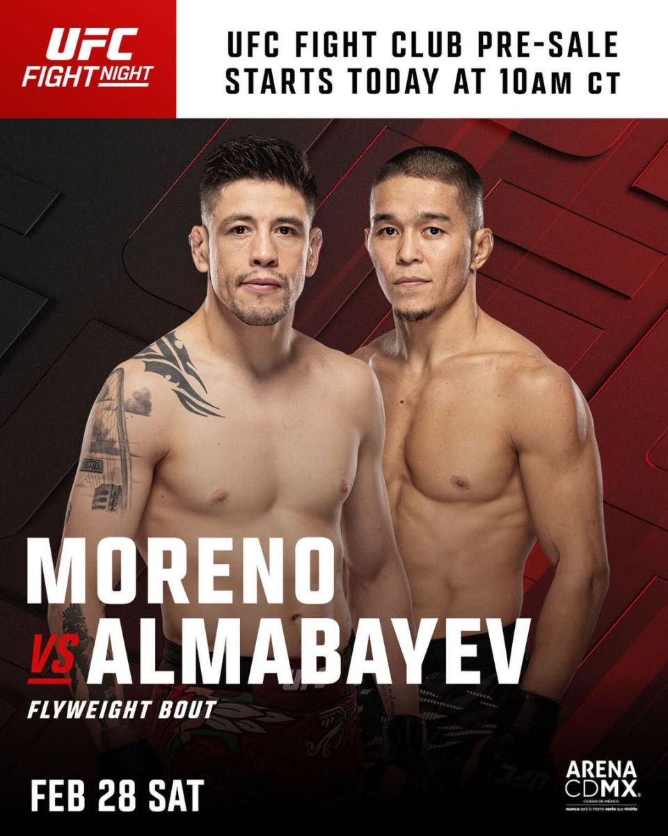 UFC qozog'istonlik jangchi Asu Almabaev va meksikalik Brendon Moreno o'rtasidagi jangni rasman tasdiqladi.