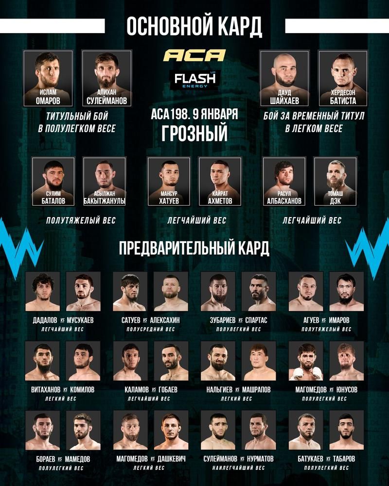 Turnirning asosiy jangi yarim engil vaznda revansh maqomida bo'lib, unda amaldagi ACA chempioni Islam Omarov divizion reytingida birinchi o'rinni egallab turgan Alixan Suleymanov bilan hisob-kitob qiladi.