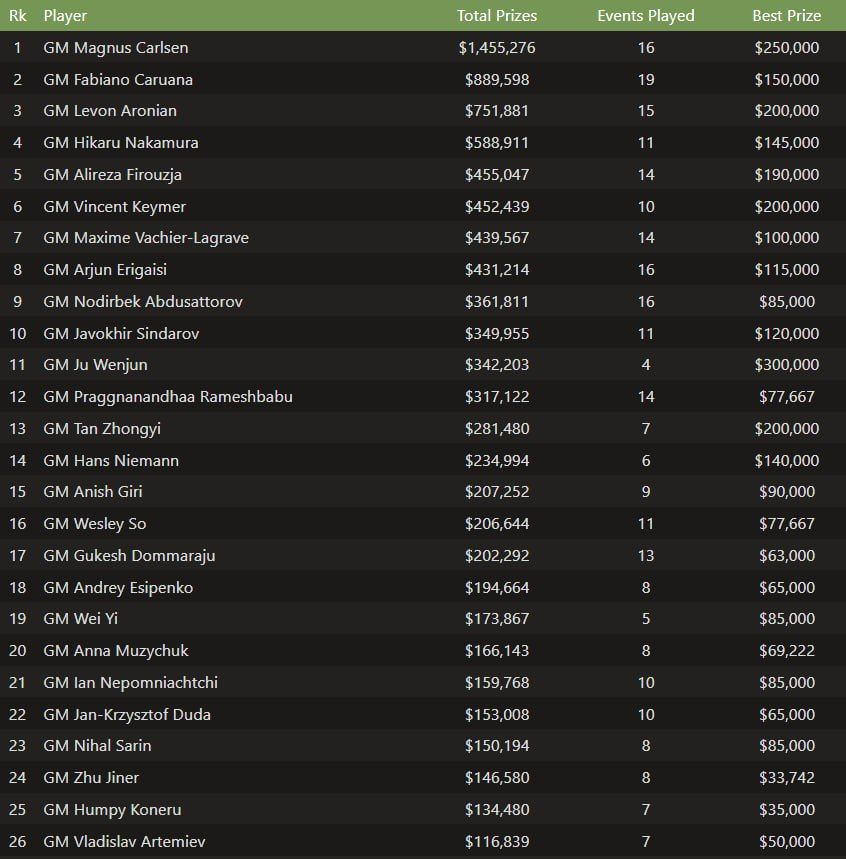 Рўйхатни кутилганидек, шахмат афсонасига айланиб улгурган норвегиялик Магнус Карлсен бошқариб бормоқда. Айнан у миллионлик маррани забт этган ягона шахматчи ҳисобланади. Яқиндагина рапид ва блиц йўналишларида жаҳон чемпионига айланган Магнус 2025 йилда 1 миллион 455 минг 276 АҚШ доллари миқдорида мукофот пуллари ишлаб топган. Бу суммага алоҳида чақирув учун шахматчига берилган пуллар кирмайди.