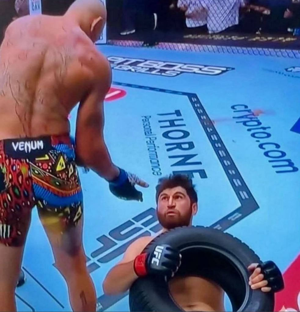 Поатан ижтимоий тармоқда жангдаги ғалаба лаҳзасидан скриншот жойлади — у ерда Перейранинг ғалаба ишораси фонида Анкалаев канвасда ётибди. Анкалаевнинг қўлига эса автомобиль шинаси чизилган.