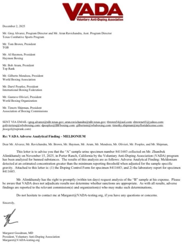 Унинг допинг таҳлилида тақиқланган мельдони моддаси аниқланган. Жанибек шу якшанба тонггида WBA Refular чемпиони кубалик Эрисланди Ларага қарши рингга чиқиши керак эди. Натижада жанг ташкилотчилар томонидан расман бекор қилинди. Лекин Лара бокс оқшомида рингга чиқади. Қисқа фурсатда унга янги рақиб берилди.