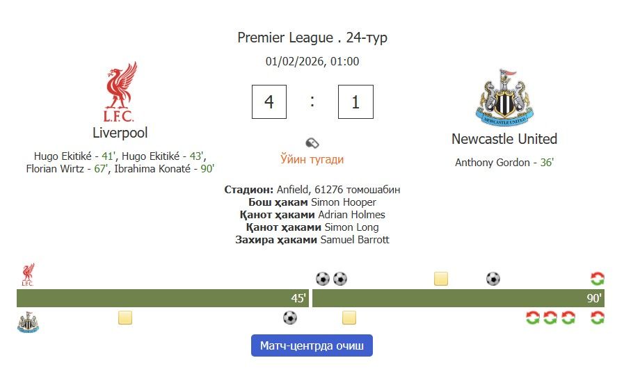 Дастлаб “Ньюкасл” 36-дақиқада Антони Гордоннинг аниқ зарбаси билан ҳисобни очди. “Ливерпуль” шундан сўнг Уго Экитике (дубль), Флориан Вирц ва Ибраима Конатенинг голлари эвазига йирик ғалабага эришди.