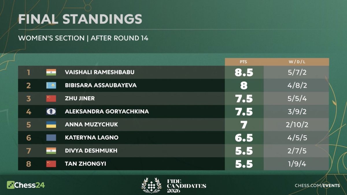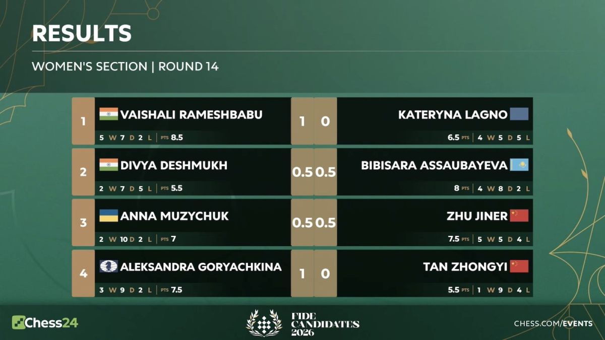 Аёллар ўртасидаги турнирда эса чемпионлик масаласи сўнгги 14-турда ҳал бўлди. Ҳиндистонлик Вайшали Рамешбабу оқ доналарда Катерина Лагнони мағлубиятга учратди ва 8,5 очко билан Жаҳон тожи учун кечадиган матч йўлланмасини қўлга киритди. Қозоғистонлик Бибисара Ассаубаева эса 14-турда қора доналарда ҳиндистонлик Дивья Дешмуҳ билан дурангга рози бўлди ва бунинг натижасида йўлланмадан қуруқ қолди. У 8 очко тўплаган ҳолда мусобақа иккинчи ўринда якунлади. Фақат ғалабагина Бибисаранинг ғолиблик учун имкониятини сақлаб қоларди.