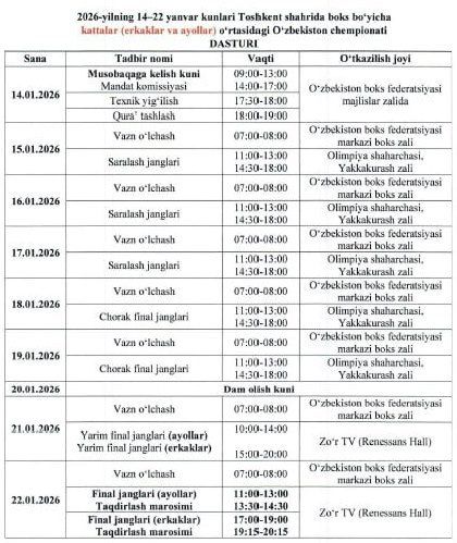 Olamsport.com муҳаррири Азиз Тўхтамуродов ўз Telegram каналида бокс бўйича эркаклар ва аёллар ўртасида ўтказиладиган навбатдаги мамлакат биринчилиги тақвимини чоп этди.