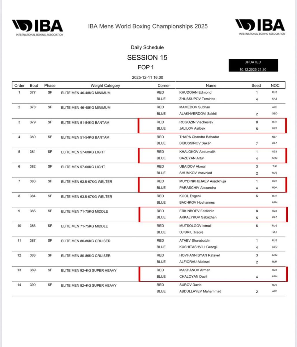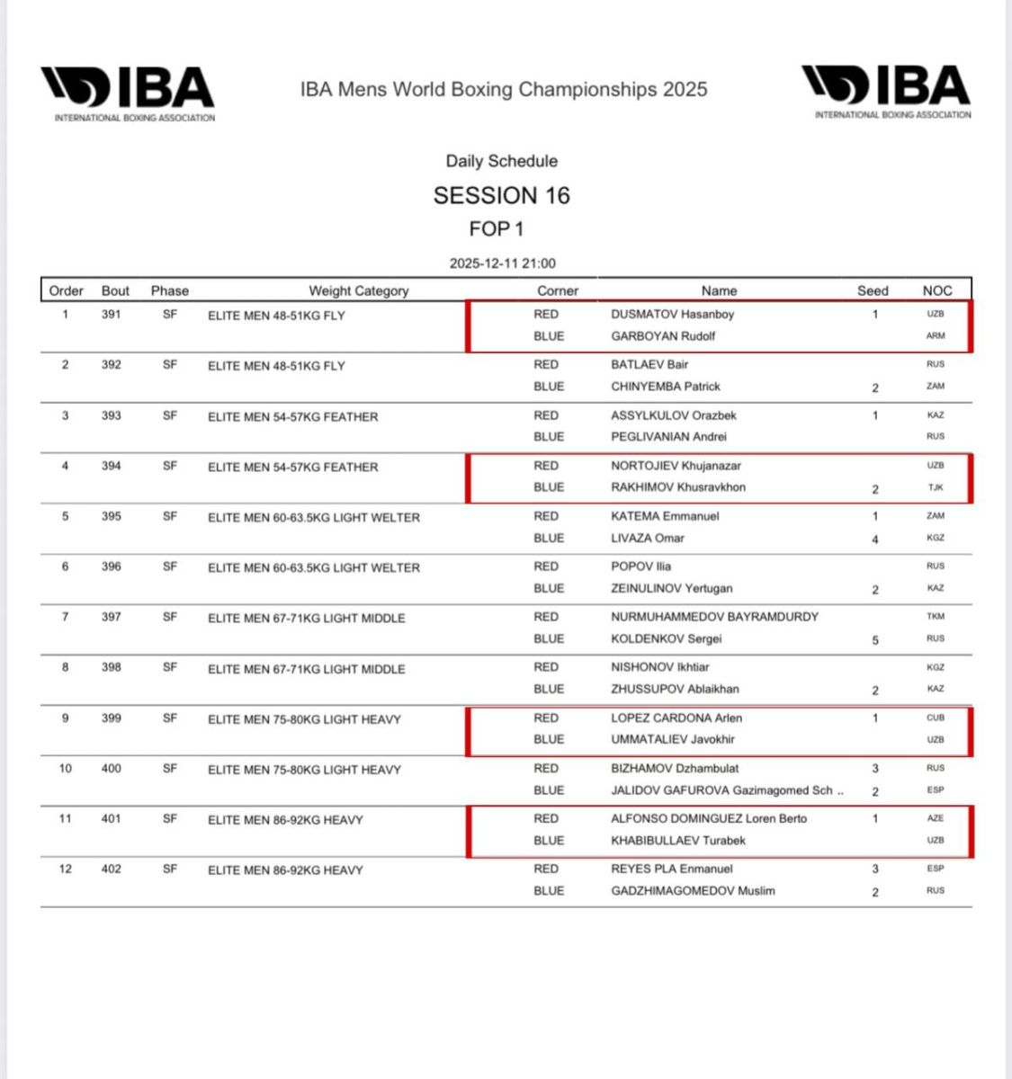 Бугун 9 нафар боксчимиз IBA Жаҳон чемпионати финал чиптаси учун рингга чиқади (Жуфтликлар)