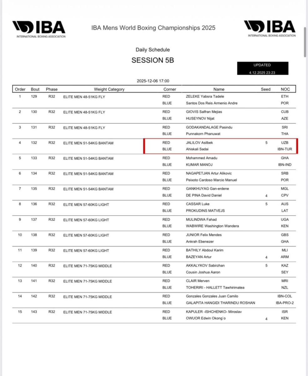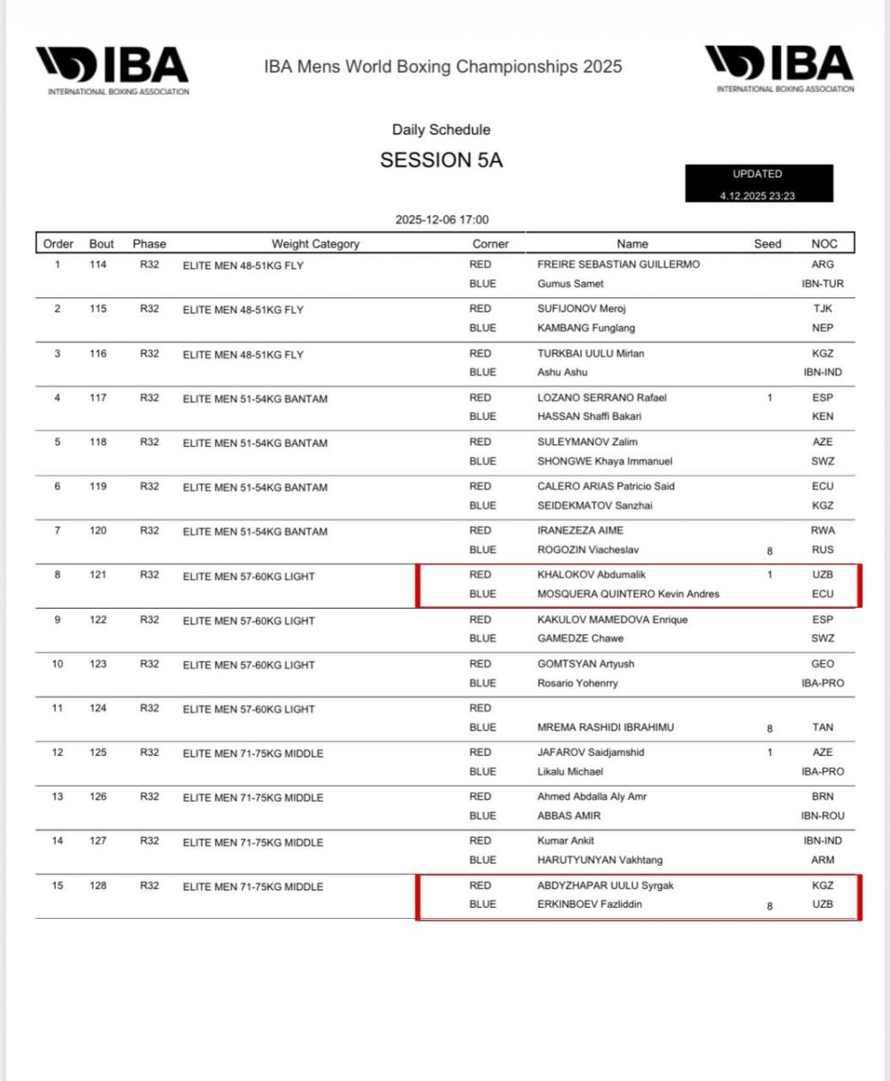 Олимпиада чемпиони, икки карра жаҳон чемпиони Абдумалик Халоков айнан бугундан ўз юришини бошлайди. Бухоролик боксчимиз эквадорлик Кевин Москуэрага қарши рингга кўтарилади. Асилбек Жалилов туркиялик Садаи Ахискали, Фазлиддин Эркинбоев эса қирғизистонлик Сиргак Абдижапар уулу билан ҳисоб-китоб қилади.