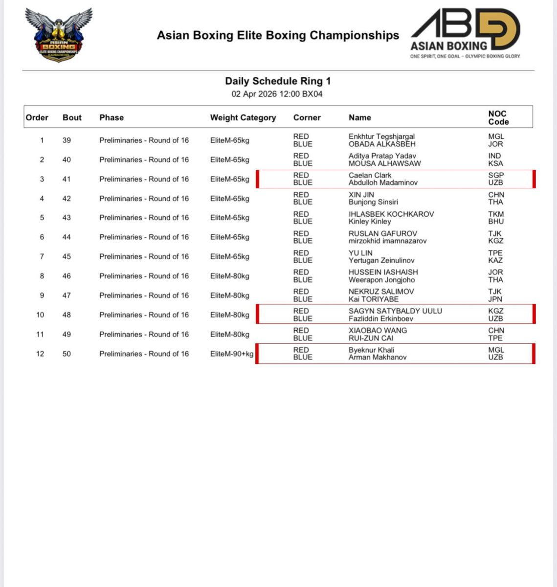 -65 кг: Абдуллоҳ Мадаминов - Каелан Кларк (Сингапур) соат 09:30