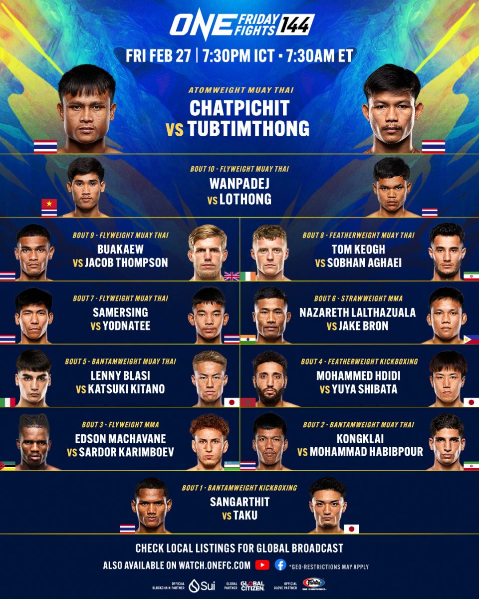 Бугун Таиланднинг Бангкок шаҳрида аралаш якка курашлар (ММА, кик-бокс, муай-тай) бўйича ONE Friday Fights 144 турнири ўтказилади.