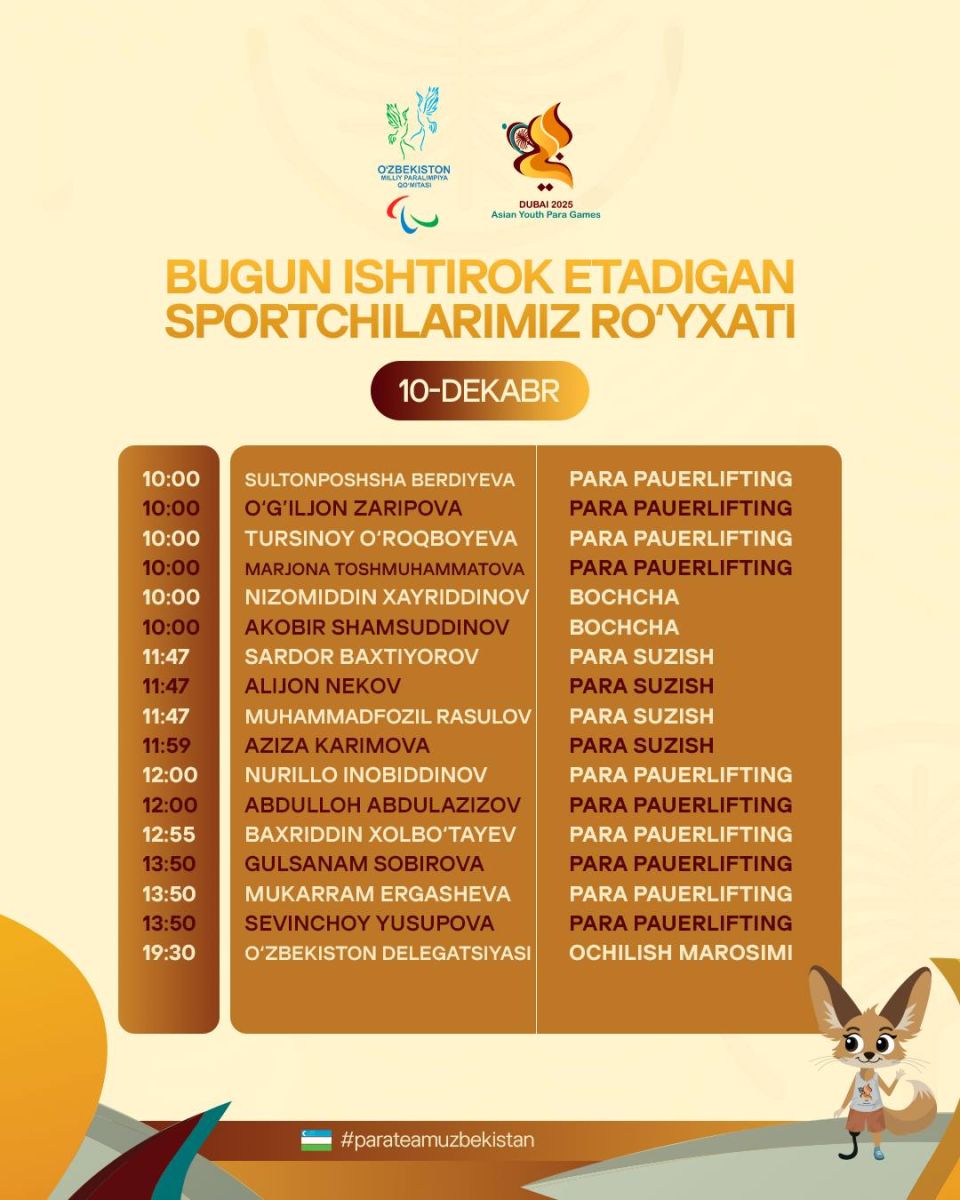 Кун давомида ҳамюртларимиз пара пауерлифтинг, пара сузиш ва бочча бўйича баҳсларда чиқиш қилади. Шунингдек, куннинг иккинчи қисмида делегациямиз ўйинларнинг тантанали очилиш маросимида қатнашади.