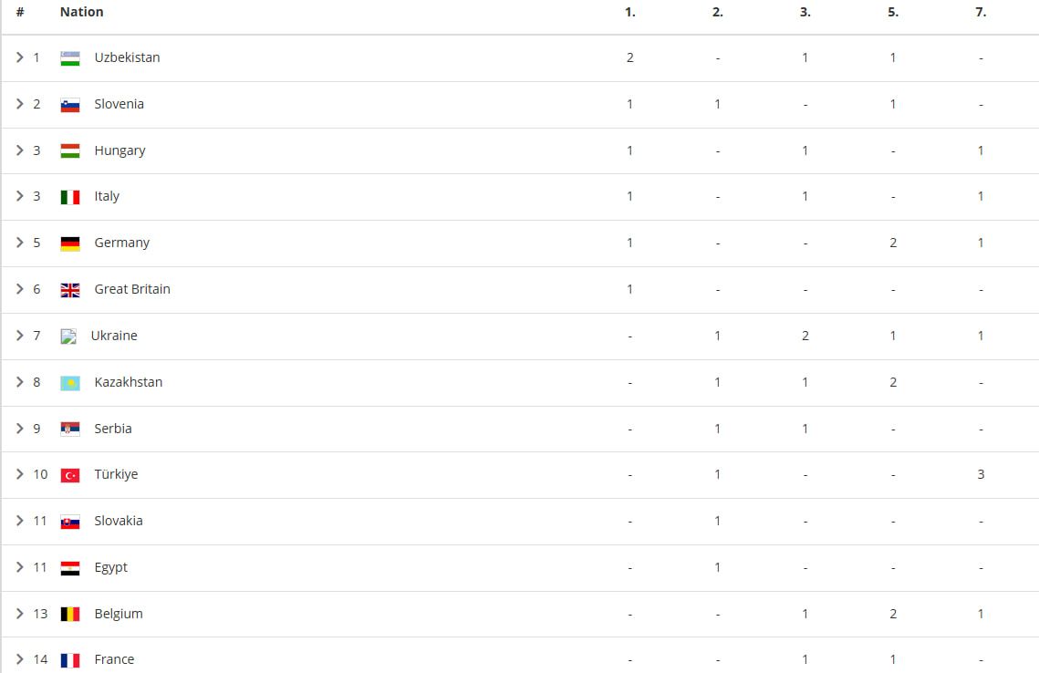 Бу билан Алексей Будолин бошчилигидаги терма жамоамиз медаллар жамғариш бўйича дунёнинг 44 давлати орасида пешқадамга айланиб олди. Кучли учликда Словения ва Венгрия терма жамоалари жойлашган. Кейинги поғоналарда Италия, Германия, Буюк Британия, Украина, Қозоғистон, Сербия, Туркия делегациялари бормоқда.