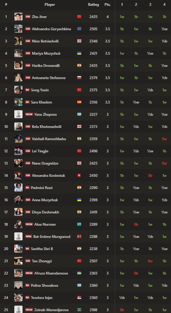 Аёллар ўртасида Афруза Ҳамдамова 3 очко билан терма жамоамиздаги энг яхши натижани қайд этмоқда - 22-ўрин. Гулруҳбегим Тохиржонова 2 очко билан ҳозирча 56-поғонада бормоқда. Бугун рапид баҳслари давом эттирилади.
