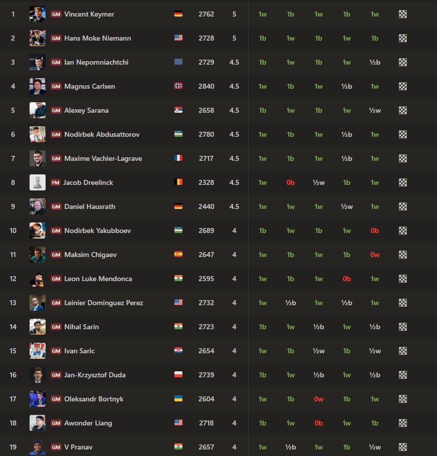 Бешинчи турдан сўнг Нодирбек Абдусатторов 4,5 очко жамғарган ҳолда қўшимча кўрсаткичларга кўра 6-ўринни эгаллаб турибди. Винсент Кеймер ва Ҳанс Мок Ниеманн 5 очкодан тўплаб, юз фоизлик кўрсаткич билан турнир жадвалида қўшҳокимлик қилишяпти. Жами 9 нафар шахматчи ҳисобида 4,5 очкодан бор. Нодирбек Якуббоев 4 очколилар орасида энг яхши кўрсаткичга эга ва у умумий жадвалда Топ-10`таликка якун ясаган. Шамсиддин Воҳидов 3,5 очко билан 31-ўриндан жой олган бўлса, 3 очкога эга Афруза Ҳамдамова 81-поғонада бормоқда.
