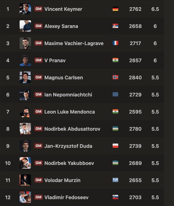 Еттинчи турда Магнус Карлсен билан дуранг ўйнаган германиялик Винсент Кеймер 6,5 очко тўплаган ҳолда якка пешқадам бўлиб турибди. Сербиялик Алексаей Сарана, француз Максим Вашье-Лаграв ва ҳиндистонлик Пранав 6 очко билан кейинги ўринлардан жой олган.