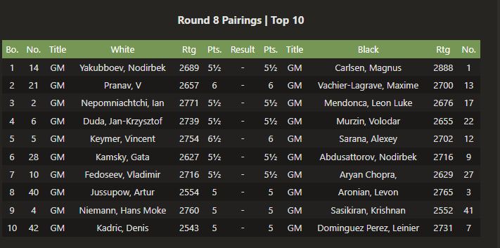 Бугун тур олдидан Шамсиддин Воҳидов 4,5 очко билан қўшимча коэфицентларга кўра 52, 4 очкога эга Афруза Ҳамдамова 83-ўринда бормоқда. Бироздан сўнг бошланадиган 8-турда Нодирбек Якуббоев норвегиялик шахмат афсонаси Магнус Карлсенга қарши оқ доналарда ўйнайди. Абдусатторов эса қора доналарда франциялик Гата Камский билан ҳисоб-китоб қилади. Шамсиддин Воҳидов ҳиндистонлик Сива Маҳадеван, Афруза Ҳамдамова германиялик Марк Мейерс билан тўқнаш келади.