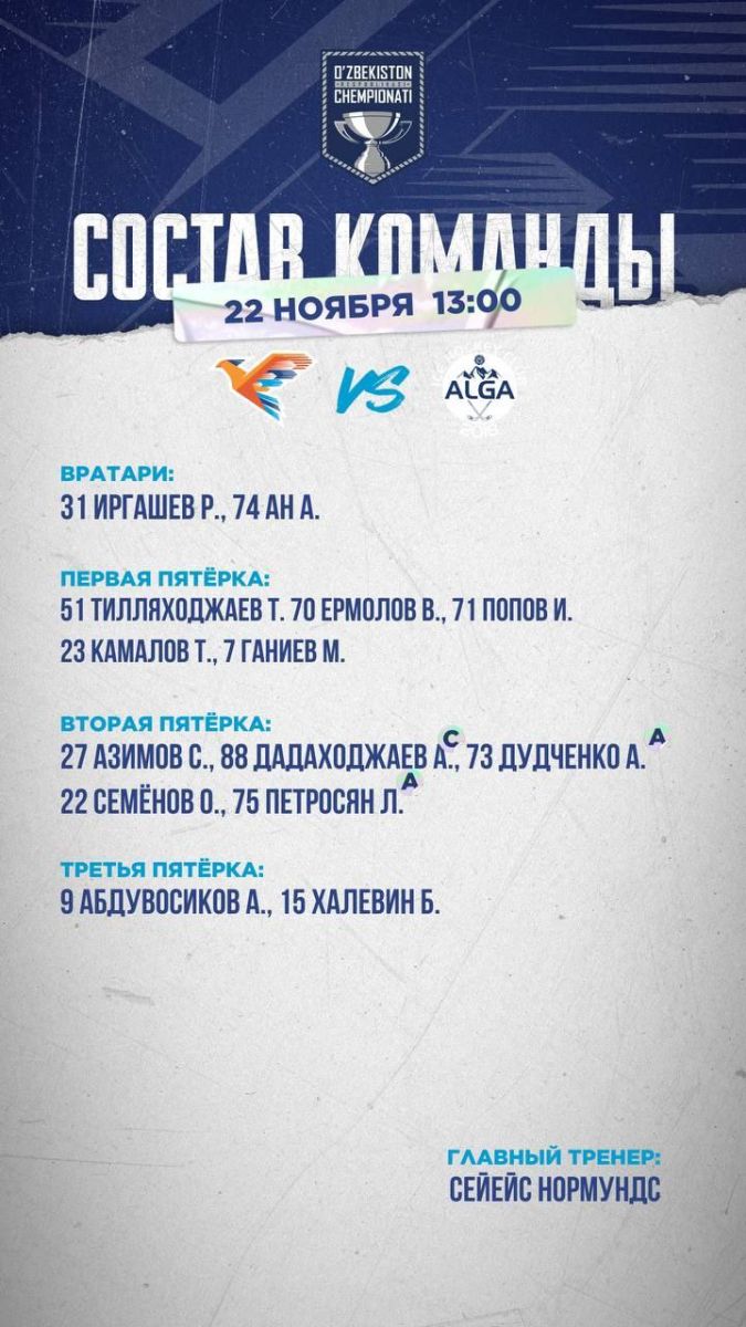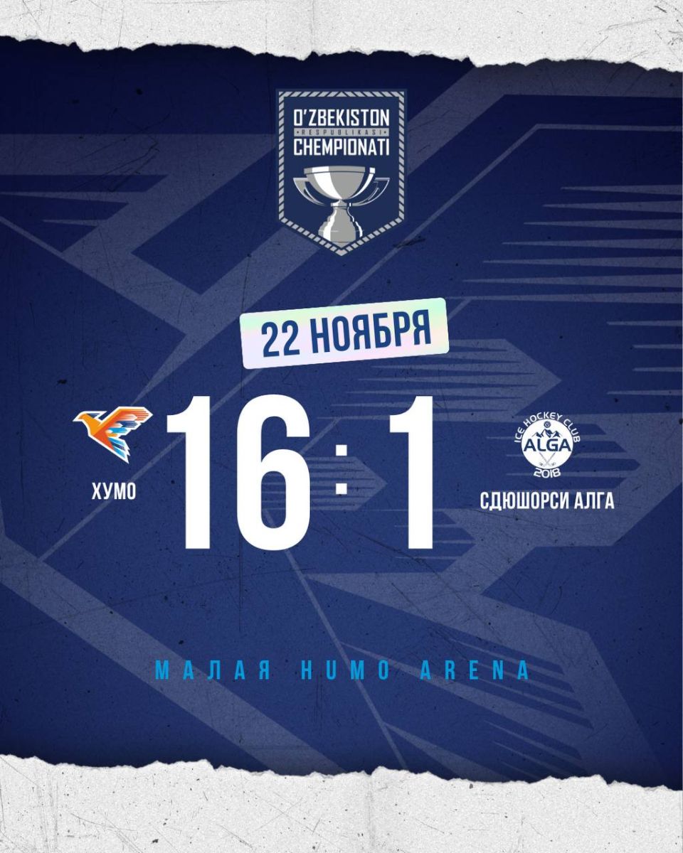Пойтахтимиздаги "Humo Arena" кўптармоқли комплексининг кичик муз аренасида ўтган учрашувда "қанотлилар" Бишкек шаҳрининг "Алга" клубини қабул қилиб, йирик 16:1 ҳисобида зафар қучишди. Эртага бу жамоалар ўртасида яна бир ўйин ўтказилади.