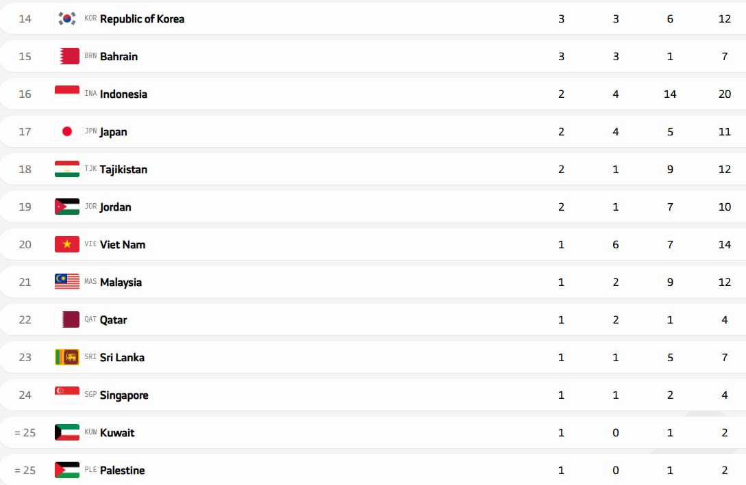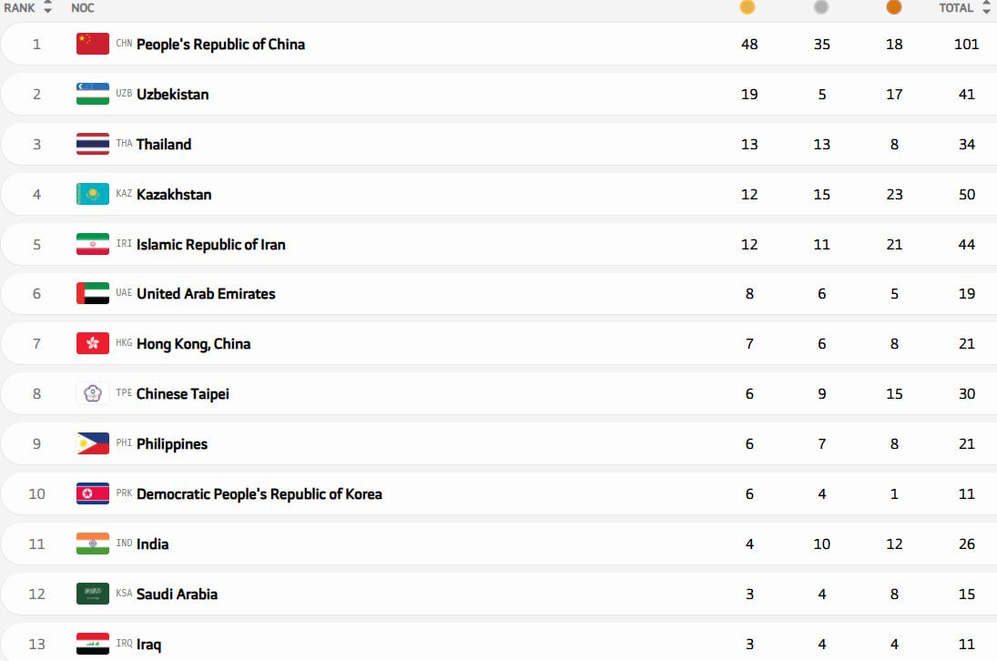 Осиё спорти гегемони Хитой терма жамоасининг умумий медаллари 101 тага етиб улгурди. Чин юрти вакиллари 48 та олтин, 35 та кумуш, 18 та бронза медалига сазовор бўлишди. Ён қўшниларимиз Қозоғистон делегацияси 12 та олтин, 15 та кумуш, 23 та бронза, роппа-роса 50 та медаль билан 4-поғонадан жой олишган. Тожикистон (2 та олтин, 1 та кумуш, 9 та бронза) 18, Қирғиз Республикаси (4 та кумуш, 6 та бронза), 27, Афғонистон (1 та кумуш, 3 та бронза) 30, Туркманистон (1 та бронза) эса 35-ўринни банд этган.