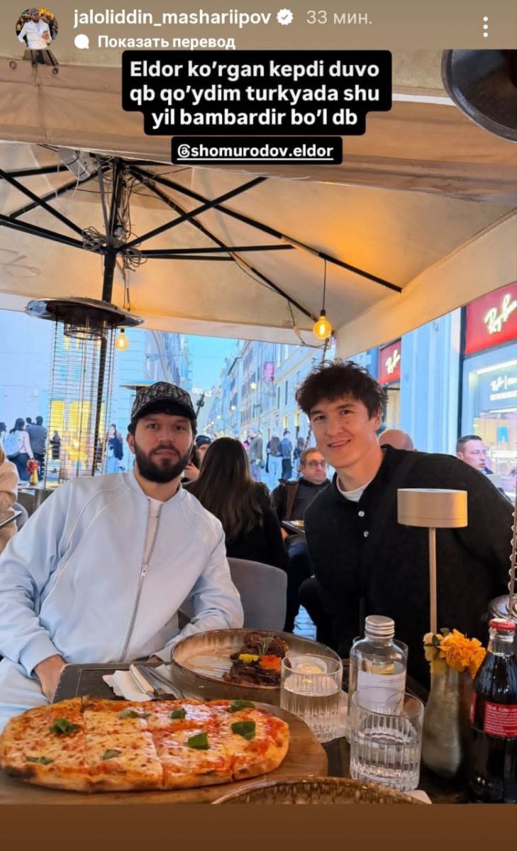 "Элдор мени кўргани келибди. Уни дуо қилиб қўйдим. Туркияда тўпурар бўлсин деб", - деб ёзиб қолдирган Машарипов ўзининг ижтимоий тармоқдаги саҳифасида.