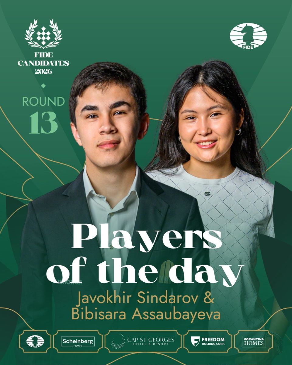 Қизиғи, сўнгги кунларда кенг муҳокамаларга сабаб бўлаётган Жавоҳир Синдаров ва Бибисара Асаубаева кеча ўтказилган 13-турнинг "Энг яхши шахматчилари" (Player of the Day) деб топилди.